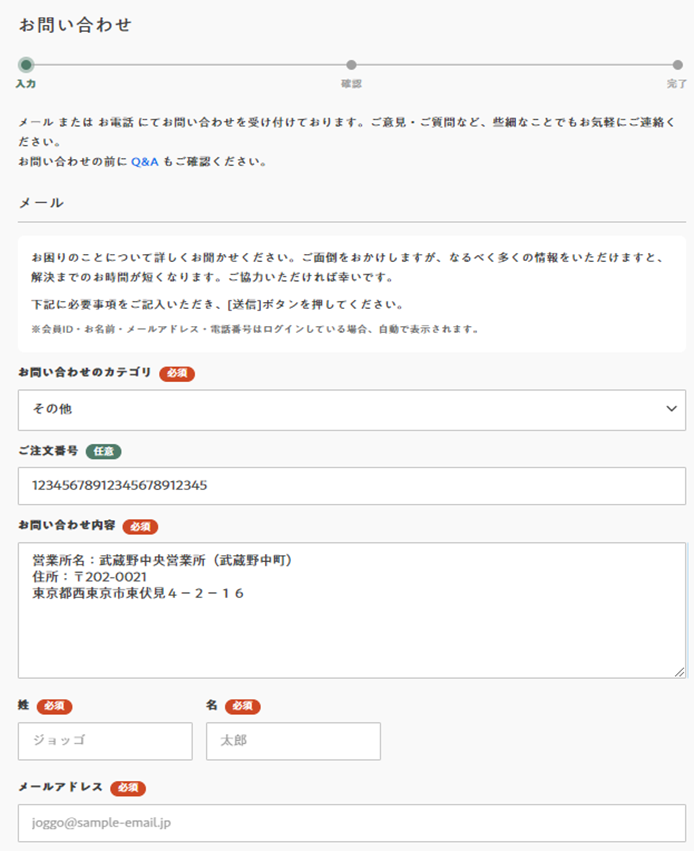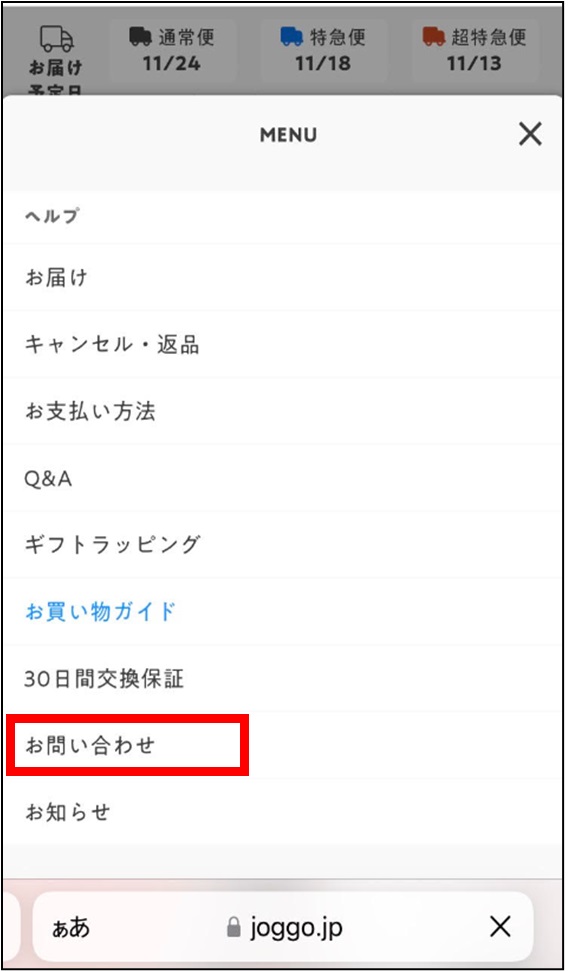 営業所で受け取る方法は、JOGGO公式サイトで商品を注文した後、問い合わせフォームで”営業所名”と”住所”を入力だけです。