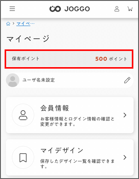 JOGGO(ジョッゴ)の公式サイトに戻ってマイページを確認し、500ポイント付与されていることを確認しましょう。