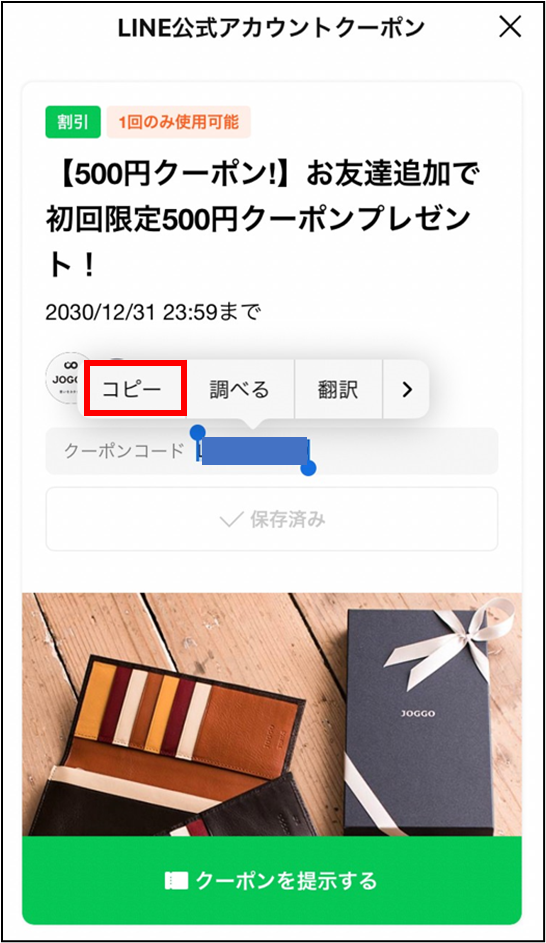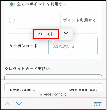 ■LINEのメッセージに戻り、クーポンをコピーして、クーポンコードの枠にペーストします。