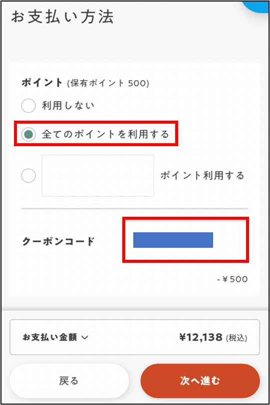 ■「全てのポイントを利用する」と「クーポンコード」が入力されていることを確認して次へ進むをタップします。