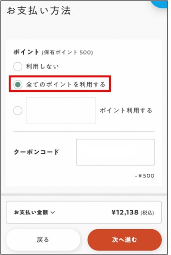 ■次へ進むと、お支払い方法の画面になるので、ここで全てのポイントを利用するにチェックを入れます。