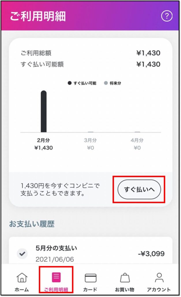 また、コンビニ払いの場合「すぐ払いへ」の処理を行うことで、翌月の確定を待たず、購入した当月中に支払いを終えることができます。