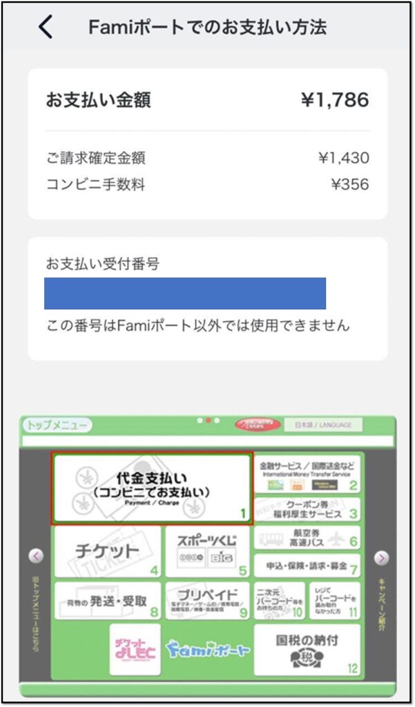 ファミリーマートの場合は、ファミポートでレシートを発行して、レジで支払います。
